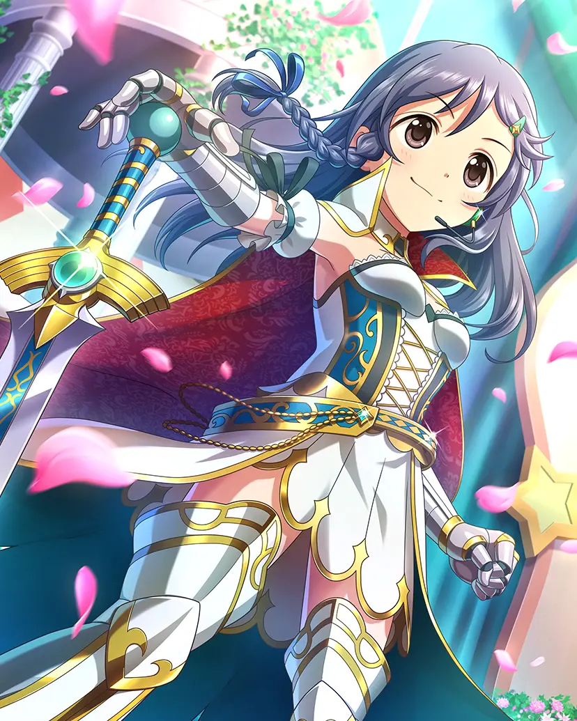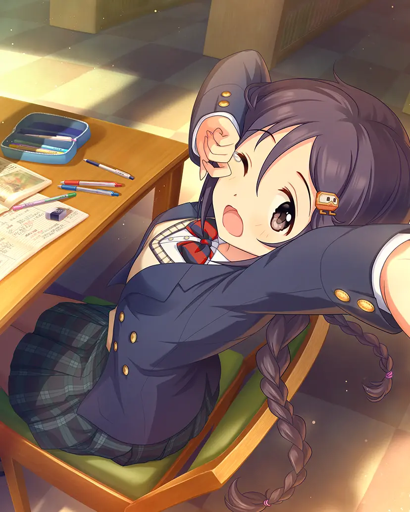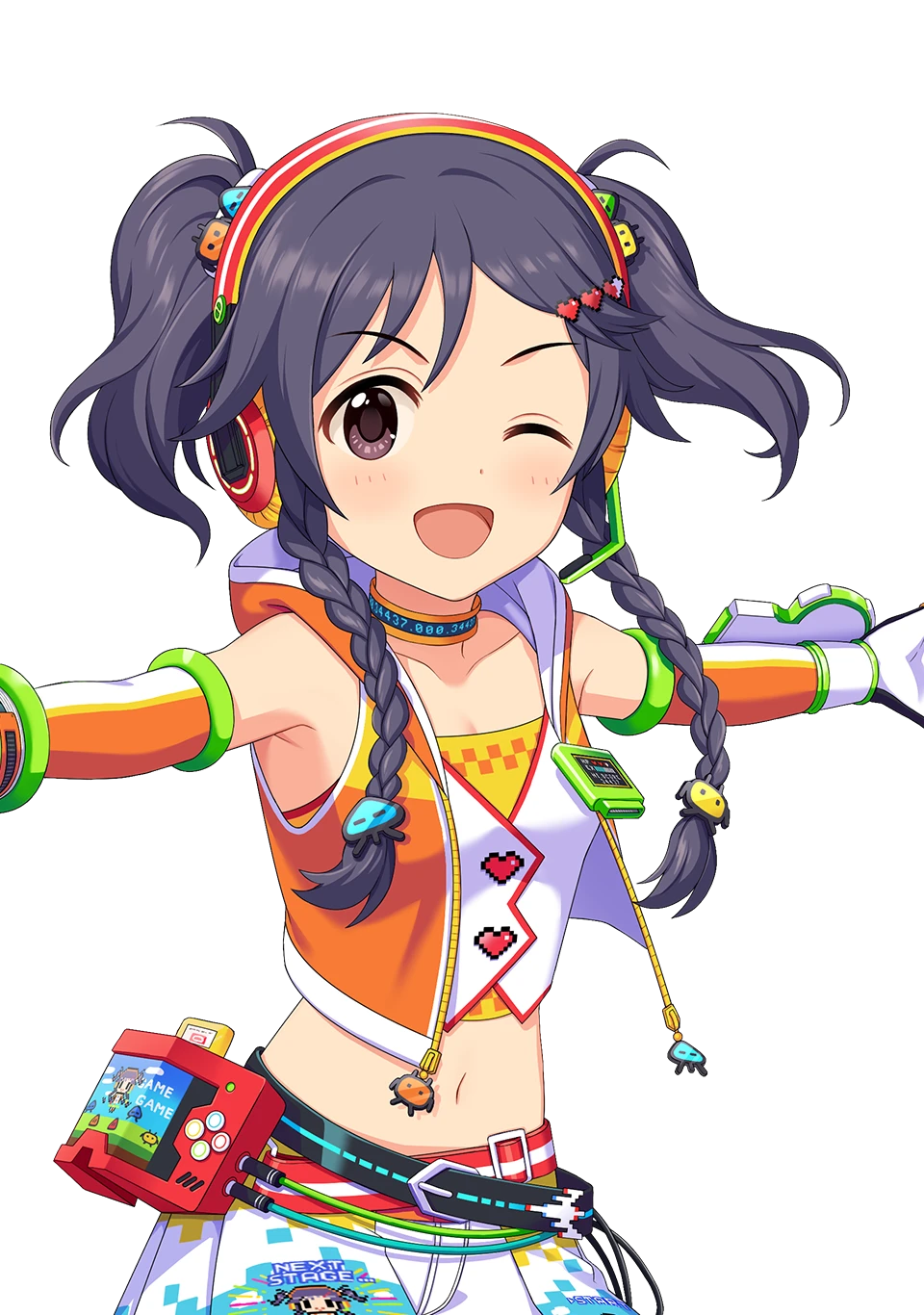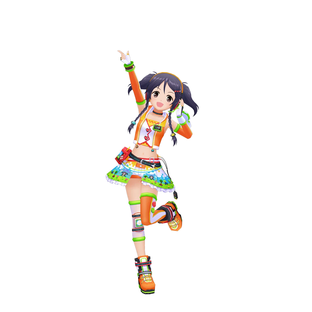 三つ編みツインテールが特徴のゲーマーアイドル。レトロなものから最新ゲームまで、ゲームと名のつくものならなんでも大好き。前向きで明るい性格。どんなレッスンやお仕事でもゲームのクエストや攻略になぞらえて楽しんでいる。